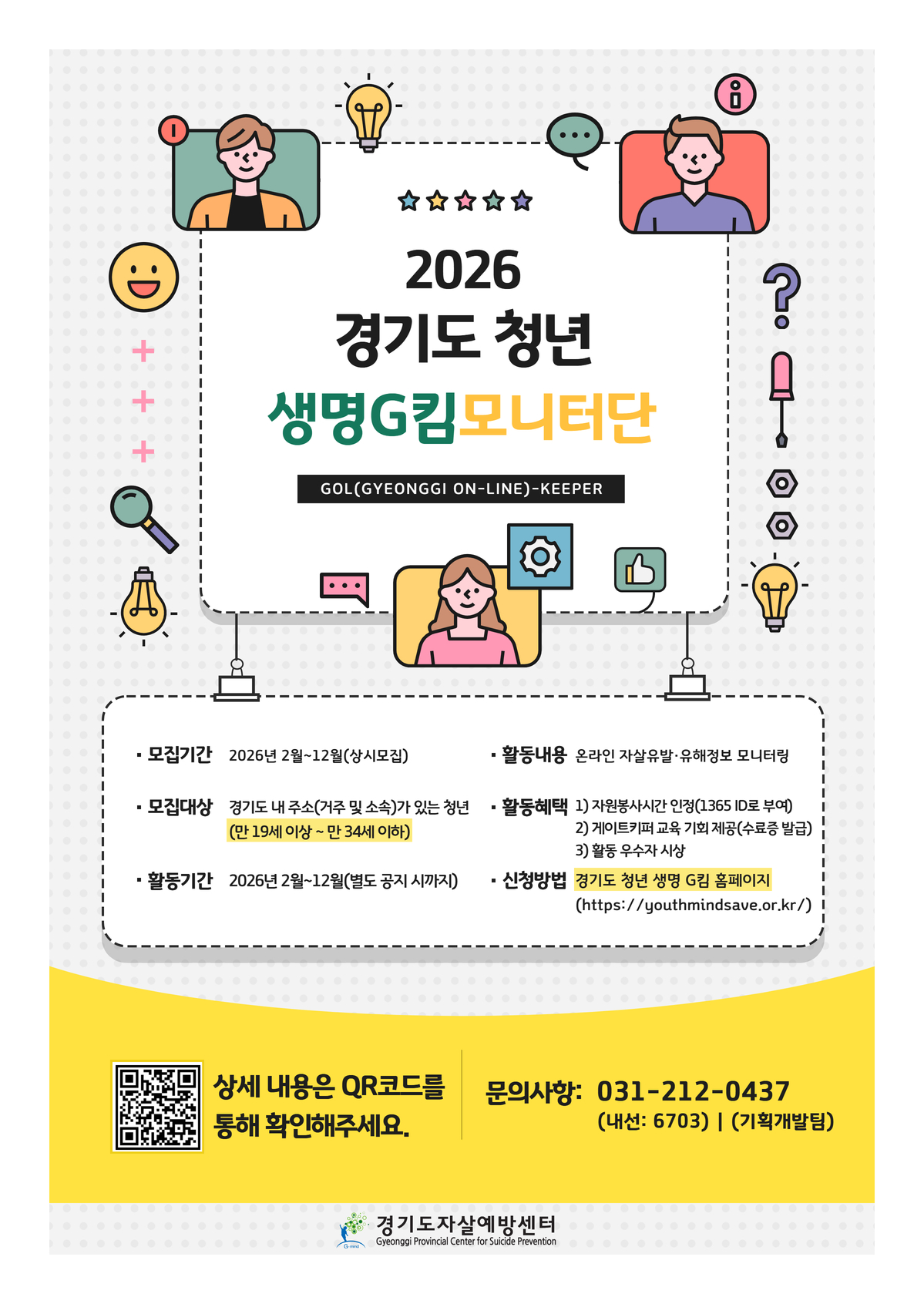 페이지당 건수 12 24 36 48 60 정렬 번호 제목 작성자 작성일 제목 작성자 내용 검색 마음을 지원하는 마음건강케어 재난 이후의 마음 이야기 2026 경기도 청년 생명사랑.. G-mind 정보카드 1월호 연말연시 마음 안부 묻기 가이.. G-mind 정보카드 12월호 겨울이 힘든 당신에게 (계절성.. 기념일 반응, 마음 돌봄 가이.. 경기도 심리면역 프로그램 『S.. 2025년 청년층 자살시도자 .. 2025년 청년층 자살시도자 .. G-mind 정보카드 11월호 <<<1 2345678910>>>