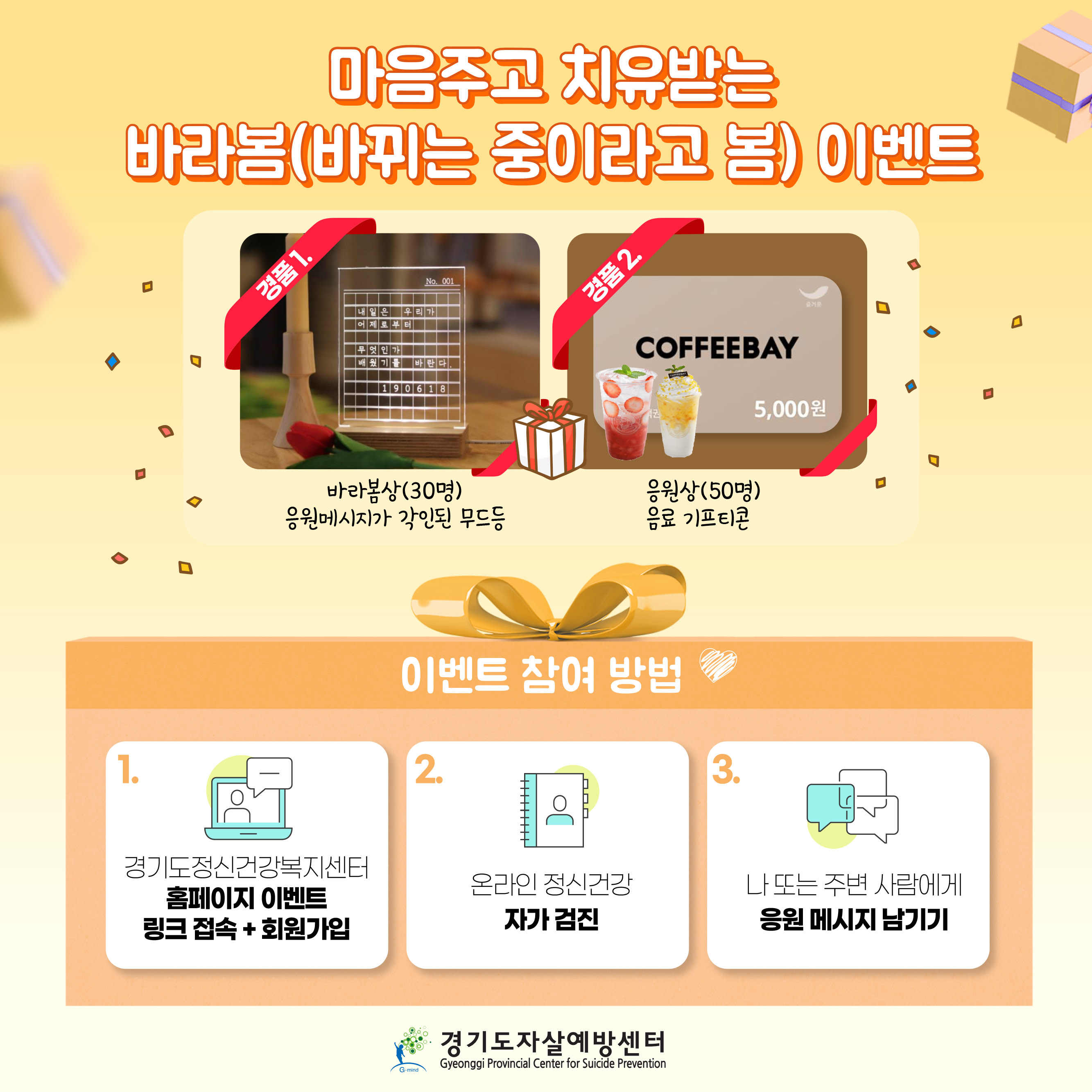 - 다음글 2021년 상반기 경기도 자살예방 캠페인 <바뀌는 중이라고 봄, 바라봄 이벤트> 당첨자 발표