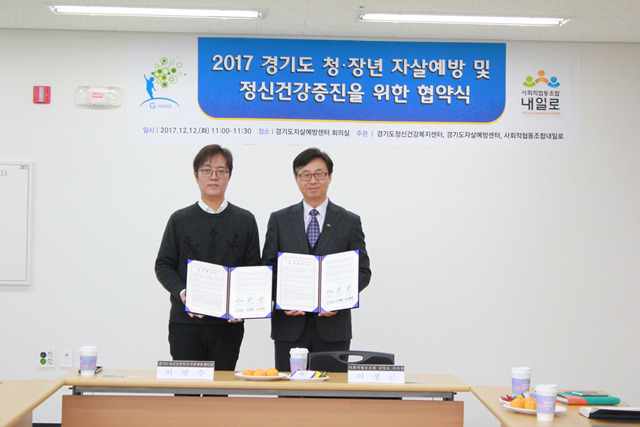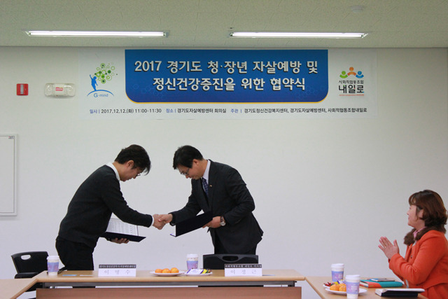 제목 : 2017 경기도 청장년 자살예방을 위한 협약식 작성자 : 관리자 작성일 : 2017-12-22 조회수 : 25962 2017년 12월 12일 화요일 11시 경기도자살예방센터에서 사회적협동조합 내일로와 도내 청장년 자살예방을 위한 업무 협약식을 진행하였습니다. 협약식에는 사회적협동조합 내일로 이정근 이사장님, 조인희 본부장님, 주인원 실장님, 경기도자살예방센터 이명수 센터장님 외 직원분들이 참여하였습니다. 도내 청장년을 대상으로 정신건강 및 자살예방 서비스를 제공하고, 자살 고위험군 조기발견 및 개입을 통해 청장년 자살률 감소를 기대합니다. 이전글 재난심리지원 전문가 심화교육 다음글 생명사랑 틴틴교실 교사대상 강사양성 교육 목록