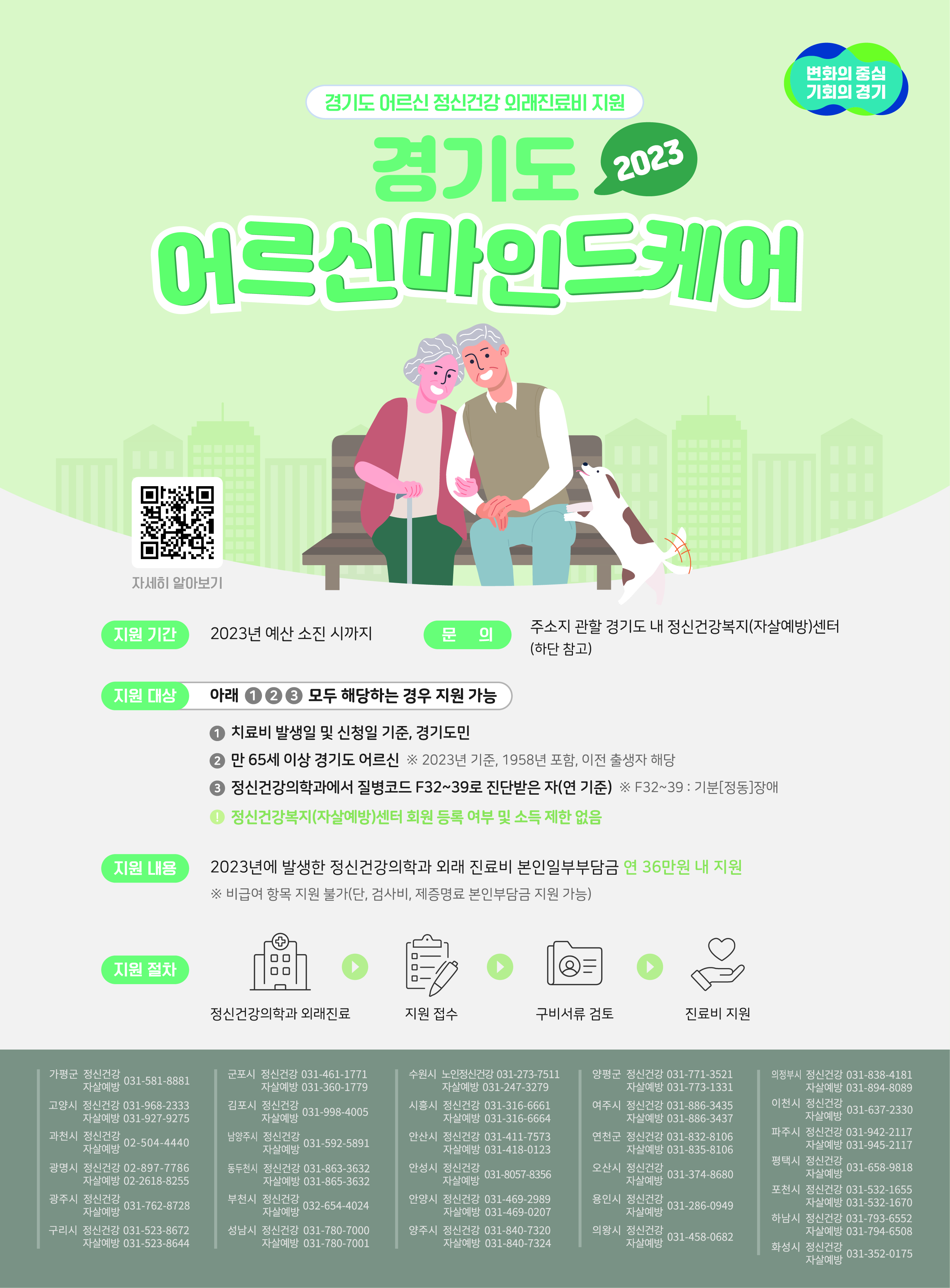 제목 : 2023년 경기도 어르신 정신건강 외래진료비 지원 「어르신마인드케어」 사업 안내 작성자 : 관리자 작성일 : 2023-03-08 조회수 : 15163 첨부파일 포스터.jpg ☞어르신마인드케어 자세히 알아보기☜ 이전글 경기도 청년 생명사랑 모니터단 5기 모집 안내 다음글 2023년 경기도 정신건강 진료비 지원 「경기도 마음건강케어」 사업 안내 목록